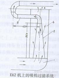 E62機(jī)上的吸棉過(guò)濾系統(tǒng)l—風(fēng)機(jī)排出的含塵空氣;2—錐形濾網(wǎng);3—纖維排