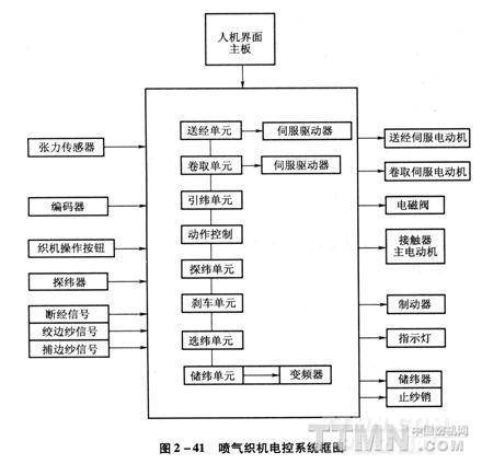噴氣織機(jī)電控系統(tǒng)目前通常主要控制對象有:主電動(dòng)機(jī)、剎車制動(dòng)器(或離合制動(dòng)器)、儲(chǔ)緯器、止紗銷、電磁閥、送經(jīng)伺服電動(dòng)機(jī)、(卷取伺服電動(dòng)機(jī))、指示燈等(圖2~41)。
