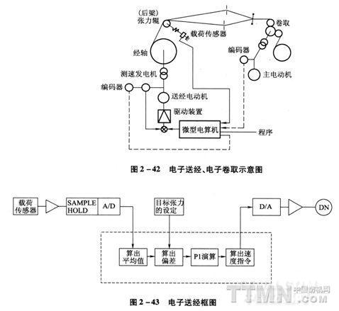 送經(jīng)控制單元負(fù)責(zé)檢測經(jīng)紗張力信號(hào)、計(jì)算經(jīng)軸直徑大小、按要求控制送經(jīng)伺服電動(dòng)機(jī)的轉(zhuǎn)速和轉(zhuǎn)向。根據(jù)織物對經(jīng)紗總張力的要求,在人機(jī)界面上設(shè)定經(jīng)紗張力目標(biāo)值、經(jīng)軸直徑的初始值和織物緯密。開機(jī)后送經(jīng)機(jī)構(gòu)按緯密對經(jīng)紗的需求量送出定量的經(jīng)紗,由與經(jīng)紗張力輥(后梁)連接的張力傳感器檢測經(jīng)紗的實(shí)際張力,由計(jì)算機(jī)對檢測的張力值處理后與設(shè)定值比較,通過PID演算來控制送經(jīng)伺服電動(dòng)機(jī)的動(dòng)作,達(dá)到恒張力送經(jīng)的目的。在恒張力送經(jīng)時(shí),可以隨時(shí)精確計(jì)算出經(jīng)軸直徑,將計(jì)算值替代初始值或前一計(jì)算值(圖2—42~圖2—43)。