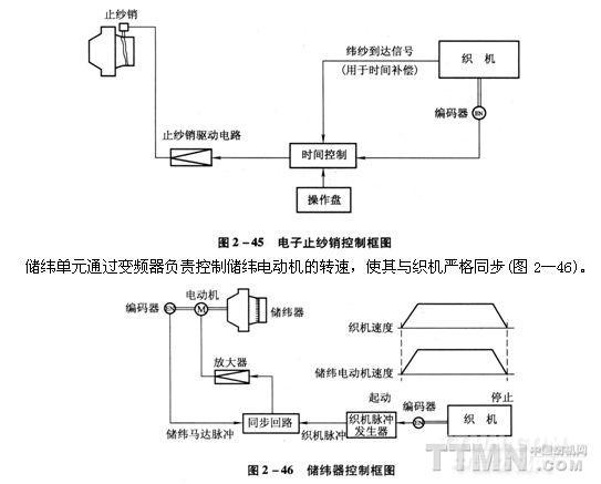 儲(chǔ)緯單元通過變頻器負(fù)責(zé)控制儲(chǔ)緯電動(dòng)機(jī)的轉(zhuǎn)速,使其與織機(jī)嚴(yán)格同步(圖2—46)。
