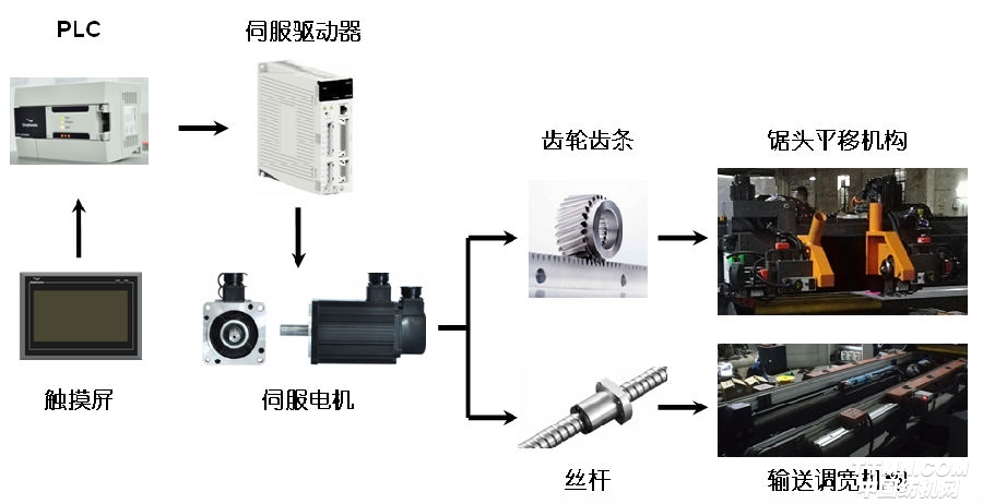基本工作原理為:四方電氣CA100伺服系統(tǒng)通過齒輪齒條及絲桿分別帶動鋸頭平移機構(gòu)和輸送調(diào)寬機構(gòu)。鋸切位置和速度及輸送調(diào)寬的寬度由觸摸屏設(shè)置,通過Modbus通信發(fā)送至PLC,PLC再將位置及寬度轉(zhuǎn)化為控制伺服位置及轉(zhuǎn)速的脈沖信號控制伺服系統(tǒng)運行。脈沖的個數(shù)及頻率決定了伺服電機轉(zhuǎn)動的圈數(shù)(即鋸切位置和寬度)和運行的速度。
