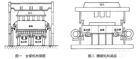 按振動(dòng)源作用的位置不同,砌塊成型機(jī)可分為臺(tái)振機(jī)及模振機(jī)。振動(dòng)源直接作用于振動(dòng)臺(tái)的機(jī)型稱為臺(tái)振機(jī),型號(hào)以“QT”開(kāi)頭。振動(dòng)源安裝在模箱上的機(jī)型稱為模振機(jī),型號(hào)以“QM”開(kāi)頭。因臺(tái)振機(jī)具有產(chǎn)量大、砌塊平均損耗振動(dòng)功率小等優(yōu)點(diǎn),已成為國(guó)內(nèi)磚機(jī)廠家的主流機(jī)型。圖一、圖二分別為臺(tái)振及模振機(jī)構(gòu)簡(jiǎn)圖。以臺(tái)振機(jī)為例,一般振動(dòng)器是由電動(dòng)機(jī)或液壓馬達(dá)來(lái)驅(qū)動(dòng),通過(guò)振動(dòng)器中的兩根帶有偏心塊的軸產(chǎn)生相向的高速轉(zhuǎn)動(dòng),水平方向的離心力互相抵消、垂直方向的離心力互相疊加,從而產(chǎn)生垂直定向振動(dòng)。成型砌塊較少時(shí),模箱下可設(shè)一個(gè)振動(dòng)源;成型砌塊較多時(shí),可設(shè)兩個(gè)或多個(gè)振動(dòng)源。