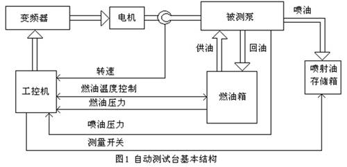 內(nèi)燃機噴油泵自動測試臺主要由異步電機驅(qū)動裝置、燃油油路及調(diào)節(jié)裝置、噴油存儲及測量裝置和計算機測控裝置等幾大部分組成。整個測試系統(tǒng)的基本結(jié)構(gòu)如圖1所示。