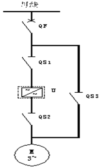 通過咨詢和現(xiàn)場分析,決定采用一拖一手動旁路方案:主回路由負(fù)荷開關(guān)QF、3個高壓隔離開關(guān)QS1、QS2和QS3及高壓變頻器組成(如圖3)。其中要求QS2和QS3不能同時(shí)閉合,在機(jī)械上實(shí)現(xiàn)互鎖。高壓隔離開關(guān)QS1、QS2、SQ3加裝電磁鎖,電磁鎖的操作電源使用QF的輔助觸點(diǎn)閉鎖。只有當(dāng)QF斷開時(shí),QS1、QS2、SQ3的電磁鎖才能得電,可以正常操作。在變頻運(yùn)行時(shí),QS1和QS2閉合,QS3斷開,變頻器得電啟動后,電機(jī)處于變頻運(yùn)行狀態(tài);工頻運(yùn)行時(shí),QS3閉合,QS1和QS2斷開,QF閉合后,電機(jī)實(shí)現(xiàn)工頻直接啟動,恢復(fù)改造前的運(yùn)行狀態(tài)。