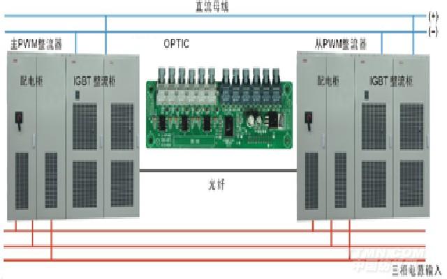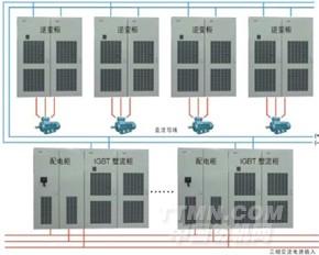 2、由于系統(tǒng)的電流較大(按1920A*2計(jì)),整流/回饋裝置分為二組,每組二臺(tái)柜,每柜內(nèi)置3個(gè)200kW功率單元,每組1200kW,共計(jì)2400kW。四臺(tái)柜共12個(gè)200kW整流回饋功率單元并聯(lián)運(yùn)行。