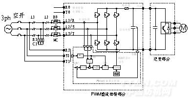 PWM整流回饋部分將三相交流電整流為直流電向直流母線電路供電,直流電路向驅(qū)動(dòng)電機(jī)的逆變器供電。直流電路可以只連接一個(gè)逆變單元,也可以連接多個(gè)逆變單元,具體用戶可以靈活配置。