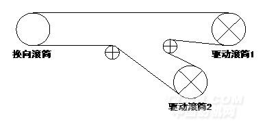 雙滾筒驅(qū)動帶式輸送機(jī)有兩種形式,一種是雙滾筒共同驅(qū)動,另一種是雙滾筒分別驅(qū)動。雙滾筒共同驅(qū)動其實(shí)質(zhì)和單滾筒驅(qū)動一樣,兩個(gè)滾筒由1:1的齒輪連接。雙滾筒分別驅(qū)動其原理類似于兩個(gè)單滾筒驅(qū)動,兩個(gè)滾筒由2臺電機(jī)拖動。雙滾筒分別驅(qū)動帶式輸送機(jī)的原理示意圖如下: