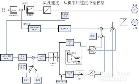 ? 當(dāng)主機(jī)和從機(jī)的電機(jī)軸采用柔性連接時(shí),主機(jī)采用速度控制,從機(jī)應(yīng)該采用速度控制模式,因?yàn)橹鳈C(jī)與從機(jī)之間允許存在微小的速度差異。