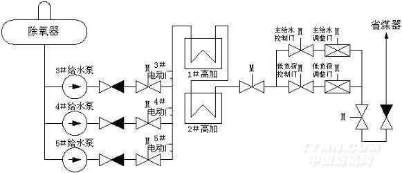 給水泵的任務(wù)是將除氧器貯水箱內(nèi)的具有一定溫度的給水,通過(guò)給水泵產(chǎn)生足夠的壓力打入汽包,汽包內(nèi)汽液分離,水送入熱鍋爐,在鍋爐環(huán)冷壁中加熱產(chǎn)生蒸汽后進(jìn)入蒸汽輪機(jī)作功,帶動(dòng)發(fā)電機(jī)組發(fā)電。根據(jù)電能生產(chǎn)的特點(diǎn)和熱鍋爐運(yùn)行的特殊要求,給水泵必須連續(xù)不斷地運(yùn)行。這不僅關(guān)系到正常發(fā)電,而且也直接關(guān)系到鍋爐設(shè)備的安全。因此,鍋爐給水泵在發(fā)電廠(chǎng)是最為重要的水泵,號(hào)稱(chēng)發(fā)電機(jī)組的心臟。給水泵工藝流程如下圖1所示: