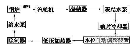 汽輪機(jī)做功后的尾氣大部分蒸氣被凝結(jié)器循環(huán)冷卻水冷凝成水,凝結(jié)水進(jìn)入熱井中,由凝結(jié)泵(兩用一備)抽出,經(jīng)軸封冷卻器和水位自動(dòng)調(diào)整裝置后,一部分通過(guò)低壓加熱器經(jīng)過(guò)加熱后送至除氧器;另一部分通過(guò)再循環(huán)調(diào)節(jié)閥回到熱井中,保證熱井液位。凝結(jié)水泵工藝流程圖如下圖2所示: