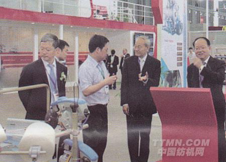 ●中國紡織工業(yè)聯(lián)合會(huì)名譽(yù)會(huì)長杜鈺洲(右二)和中國紡織工業(yè)聯(lián)合會(huì)副會(huì)長高勇  (右一)、夏令敏(左一)等領(lǐng)導(dǎo)在泰坦展位參觀。
