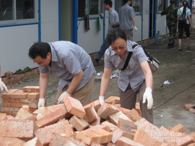 離開小漁洞,車隊來到通濟鎮(zhèn),看望慰問了成華區(qū)人武部救災指揮駐地的官兵,并在當?shù)亟M織開展黨員實踐活動,以實際行動支援災區(qū)的家園重建。六十多名志愿者分成幾個小組,分別負責對臨時安置活動板房施工現(xiàn)場的安裝材料進行歸類和場地清理工作,有的手抬肩扛,運渣土,抬磚塊,有的拿起鋤頭,鐵鍬等工具平整房間地面,組成愛心接力,將厚厚的隔墻板等裝修材料傳遞到指定位置。對臟和累,大家毫無怨言,只想能盡快搭建起溫暖的家園。中午,為了不給災區(qū)增添負擔,參加活動的志愿者個個自帶干糧,站在??寇囮牭鸟R路邊匆匆吃完午飯,顧不上休息,又繼續(xù)投入施工現(xiàn)場進行清理。