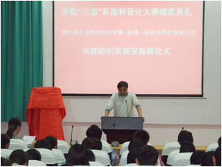 江西工業(yè)職業(yè)技術(shù)學(xué)院為了培養(yǎng)同學(xué)們的動手能力和實(shí)際操作能力鞏固所學(xué)的專業(yè)知識,為同學(xué)們將來在就業(yè)中分析和設(shè)計(jì)面料時(shí)提供一個(gè)練習(xí)的平臺,達(dá)到理論和實(shí)踐的結(jié)合。同時(shí)也讓還沒真正接觸專業(yè)課的同學(xué)學(xué)到面料分析的技術(shù)和方法拓展學(xué)生的知識面。為此,江西工業(yè)職業(yè)技術(shù)學(xué)院與南通三思機(jī)電科技有限公司聯(lián)合舉辦了“三思杯”紡織面料設(shè)計(jì)大賽,同學(xué)們表現(xiàn)出巨大熱情并積極踴躍參加。經(jīng)組委會一個(gè)月辛勤勞動圓滿完成了各項(xiàng)工作,于11月03日在江西工業(yè)職業(yè)技術(shù)學(xué)院舉行了隆重的頒獎典禮。我公司總經(jīng)理?xiàng)罨菪聭?yīng)邀參加江西工業(yè)職業(yè)技術(shù)學(xué)院“三思杯”面料設(shè)計(jì)大賽頒獎典禮,并為部分獲獎同學(xué)頒獎。