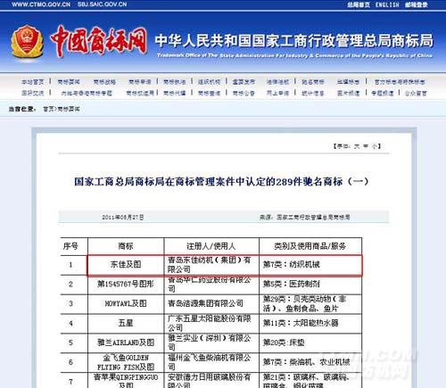在國(guó)家工商行政管理總局商標(biāo)局剛剛公布的289件馳名商標(biāo)中,青島東佳紡機(jī)(集團(tuán))有限公司的“東佳及圖”商標(biāo)名列榜首。