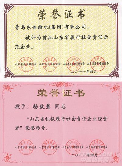 為倡導(dǎo)企業(yè)積極承擔(dān)和履行社會(huì)責(zé)任,發(fā)揮先進(jìn)示范作用,促進(jìn)企業(yè)與社會(huì)、環(huán)境的全面協(xié)調(diào)可持續(xù)發(fā)展,山東省企業(yè)聯(lián)合會(huì)、山東省企業(yè)家協(xié)會(huì)、山東省工業(yè)經(jīng)濟(jì)聯(lián)合會(huì)、山東省質(zhì)量管理協(xié)會(huì)聯(lián)合在全省企業(yè)中開(kāi)展了創(chuàng)建 “山東省首批履行社會(huì)責(zé)任示范企業(yè)”工作,省政府日前隆重召開(kāi)大會(huì)進(jìn)行表彰,我公司榮登被表彰企業(yè)之首,公司被授予“山東省首批履行社會(huì)責(zé)任示范企業(yè)”,公司董事長(zhǎng)楊效慧被授予“山東省積極履行社會(huì)責(zé)任經(jīng)營(yíng)者”稱(chēng)號(hào)。