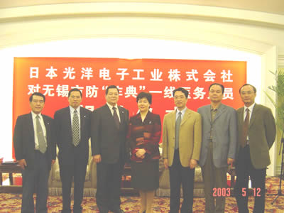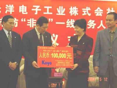 昨天是國際護士節(jié),在這個特別的日子里,無錫市湖濱飯店舉行了防“非典”捐款活動。日本光洋電子首先向市政府捐贈了10萬元人民幣,全力支持市政府抗非工作。同時這也是無錫市政府收到的第一筆, 由在錫外企愛心捐贈的抗非款。無錫市的一些主要領(lǐng)導人、抗非戰(zhàn)線中領(lǐng)導人員以及光洋電子嚴金榮總經(jīng)理、研光電子的吉田裕參加了這次活動。