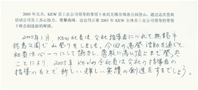 2005年元月,KEW員工在公司領(lǐng)導(dǎo)的帶領(lǐng)下來到無錫市錫惠公園登山。通過這次登高活動,公司員工齊心協(xié)力,勇攀高峰,這也預(yù)示著2005年KEW全體員工在公司領(lǐng)導(dǎo)的帶領(lǐng)下將會創(chuàng)造新的輝煌。
