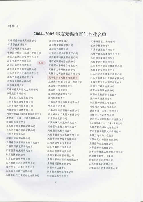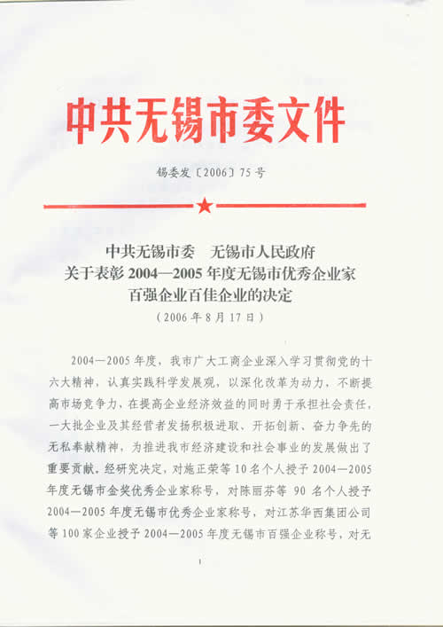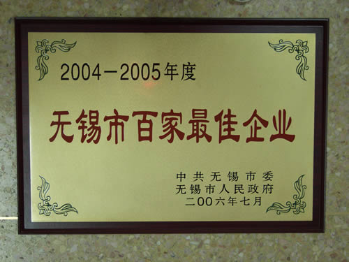 2006年8月18日無(wú)錫市人民政府在無(wú)錫市人民大會(huì)堂召開無(wú)錫市企業(yè)表彰大會(huì),我公司被評(píng)為2004-2005年度無(wú)錫市百家最佳企業(yè)。