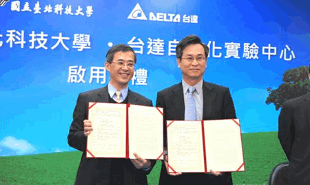 臺達(dá)機(jī)電事業(yè)部總經(jīng)理張訓(xùn)海先生(右)與北科大校長姚立德(左)一同簽立雙方合作協(xié)議