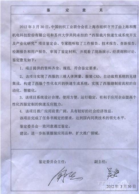 2012年3月30日,中國紡織工業(yè)聯(lián)合會(huì)專家組在上海組織召開了由和鷹科技與蘇州大學(xué)共同承擔(dān)的“西服裁片快速生成系統(tǒng)開發(fā)及產(chǎn)業(yè)化研究”項(xiàng)目鑒定會(huì)。