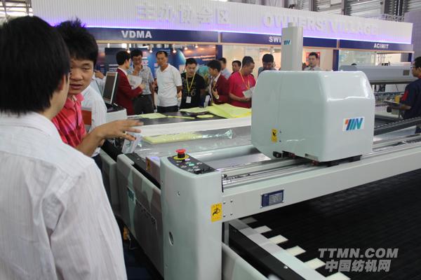 在展會開始當天,和鷹科技展出的HY-H系列數(shù)控裁剪機與單向?qū)S枚鄬愉伈紮C在會場中獨樹一幟,一經(jīng)展出,就吸引了眾多觀眾前來觀摩。