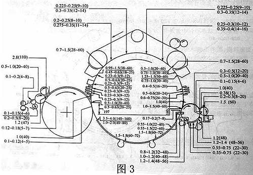 (4)錫林~蓋板隔距:根據(jù)紡紗號數(shù)、機(jī)械狀態(tài)等因素確定。