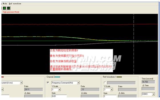 VFD-VE motor software 就是專門為VE配套的監(jiān)控軟件,也是一個(gè)很實(shí)用的數(shù)字示波器軟件。通過該軟件我們就可以很直觀的看到相關(guān)的數(shù)據(jù),從而更加判斷VE系列變頻器的不同凡響的性能。下圖是在現(xiàn)場(chǎng)的波形,通過下面的波形我們可以很直觀的看到,變頻器的輸出頻率始終是跟隨相應(yīng)的數(shù)控系統(tǒng)的設(shè)定頻率。隨著頻率的改變,其電流很運(yùn)行相當(dāng)?shù)钠椒€(wěn)。