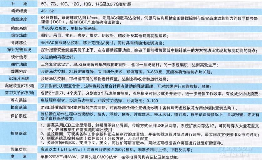 常熟市昌華針服機械廠擁有的CHJX-1-52-雙系統(tǒng)電腦橫機采用單機頭、雙系統(tǒng)的編織系統(tǒng),翻針三角復合式設(shè)計,二個系統(tǒng)皆可單獨或同時翻針,也可一系統(tǒng)翻針,另一系統(tǒng)編織。電腦控制界面采用LCD菜單形式,使得操作簡單易懂。S系列配置起底板功能,實現(xiàn)了單片布面自動起頭、自動結(jié)束的功能,讓布片的編織過程更加智能,有效地減少了編織廢紗,提高了生產(chǎn)效率。機型編織內(nèi)容豐富,主要用于羊毛衫的自動編織,適用于絲、棉、毛、滌綸、混紡等原料,可編織雙面提花、單面提花、單面無虛線提花、挑洞、絞花等有規(guī)則或無規(guī)則花樣。
