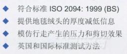 地毯動(dòng)態(tài)負(fù)載儀通過模仿兩種作用,即行走而受壓和鞋邊的剪切效果以提供地毯絨頭的厚度減低的信息。