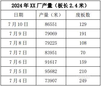 1. 下表為 xx 廠一個(gè)禮拜的產(chǎn)量統(tǒng)計(jì),平均大約每天 2.4 米標(biāo)準(zhǔn)板大約 3.5 萬(wàn)張,每張板子售價(jià) 28 元,每天產(chǎn)值 98 萬(wàn)元,一年按照 300 天計(jì)算,產(chǎn)值大約為 2.94 億元。每米標(biāo)準(zhǔn)板成本大致 3.5 元,人工、材料、能源各占三分之一: