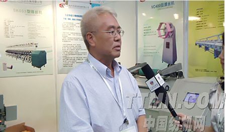 段董:這次紡機(jī)展我們推出三款新產(chǎn)品,其中主打的是兩款,根據(jù)這幾年國(guó)內(nèi)的纖維的變化很大,特別是超細(xì)的纖維,以及高彈的纖維,這些纖維的要求就是對(duì)松色染色提出了一個(gè)新的理念,用原來的絞裝染色現(xiàn)在變?yōu)樗缮沧尤旧,可以大量的?jié)約用水,從環(huán)保上從節(jié)能上從排污上是一個(gè)大的要求,我們迎合這個(gè)要求就開發(fā)了這兩款重點(diǎn)產(chǎn)品,就是解決一些,特別是針對(duì)現(xiàn)在國(guó)內(nèi)的紡織產(chǎn)品的檔次不斷的提高,纖維的要求也提高了,那么對(duì)機(jī)器的要求也就更高了,那么我們這次推出的兩款產(chǎn)品,一個(gè)焦點(diǎn)是高速,第二個(gè)是松色,第三個(gè)強(qiáng)調(diào)一個(gè)密度,這樣就解決了很多客戶現(xiàn)在在發(fā)展纖維的過程中碰到的染色的難題,同時(shí),現(xiàn)在高速織機(jī)的廣泛使用對(duì)于退解地速度要求很高,特別是針織行業(yè)和色織行業(yè),這兩塊的發(fā)展特別的快,對(duì)于絡(luò)筒的成型漲力防疊要求也高了,所以這兩款機(jī)器的關(guān)鍵的特點(diǎn)是它可以做到高速,在高速的狀態(tài)下可以做到松色,在松色的狀態(tài)下可以解決一個(gè)防疊、解決一個(gè)密度,同時(shí)這次特別有一個(gè)優(yōu)勢(shì),就是隨機(jī)的變化,就在線漲力,可以說在國(guó)外也是近幾年發(fā)展的,在國(guó)內(nèi)大家都在研究,當(dāng)然我們已經(jīng)走得比較前面了,這一個(gè)技術(shù)在我們這兩款機(jī)器已經(jīng)體現(xiàn)出來了,這就是我們公司這次帶來的三個(gè)產(chǎn)品的兩個(gè)重點(diǎn)產(chǎn)品。