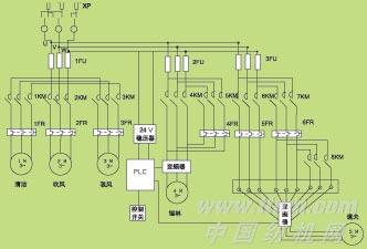 本人基于松下GT01觸摸屏,利用松下FP0-C16T可編程控制器(PLC)控制MINAS A系列變頻器來取代原機(jī)的繼電器控制系統(tǒng),使整個(gè)系統(tǒng)的操作更簡(jiǎn)便、自動(dòng)化程度更高、可靠性更強(qiáng)。A186E梳理機(jī)控制系統(tǒng)原理圖如圖1所示?梢,A186E型梳理機(jī)組改造后電氣控制系統(tǒng)以可編程序控制器(PLC)為核心,系統(tǒng)配置有電源模塊、CPU模塊、輸入模塊、中斷模塊及輸出模塊、外圍配備操作面板、指示燈、傳感器等。改造后電氣系統(tǒng)中由傳感器拾取A186E型梳理機(jī)的運(yùn)行狀態(tài)信息,經(jīng)適當(dāng)處理后,通過輸入模塊進(jìn)入CPU模塊,CPU模塊根據(jù)來自操作面板的信息和機(jī)組的狀態(tài)信息進(jìn)行邏輯控制,發(fā)出相應(yīng)的控制信號(hào),通過執(zhí)行機(jī)構(gòu)控制機(jī)組的運(yùn)行。PLC通過通訊模塊可以和人機(jī)界面連接,完成車間管理任務(wù)。斷路器起保護(hù)作用,雖然變頻器有過流保護(hù)功能,但是根據(jù)電流大小選擇合適的斷路器能起到雙重保護(hù)的功能?刂崎_關(guān)選用薄膜開關(guān),它和指示燈都安裝在控制箱的表面,具有美觀大方的特點(diǎn)。具體的控制箱內(nèi)各部件的相對(duì)位置按照電路走線和PLC變頻器的散熱要求,進(jìn)行合理的安排。PLC的輸入端子接控制開關(guān)和各種工藝自停開關(guān),輸出端子接指示燈和變頻器。圖2為 A186E電氣控制外部線路圖。