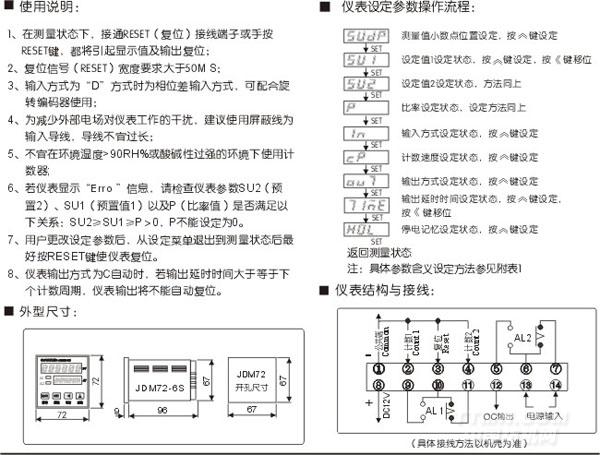 JDM72-6S計數(shù)、計米器以人性化、智能型為設(shè)計理念,內(nèi)含微處理器, 計數(shù)/預(yù)置數(shù)雙排LED顯示,設(shè)計先進(jìn)、功能強(qiáng)大、抗干擾能力強(qiáng)、計數(shù)精度高、讀數(shù)直觀;并具有以脈沖當(dāng)量為系數(shù),設(shè)定對應(yīng)計數(shù)值(即長度單位)可對計長精度進(jìn)行精確修正的先進(jìn)計長、計數(shù)功能。此外本計數(shù)器還具有下列先進(jìn)功能:
