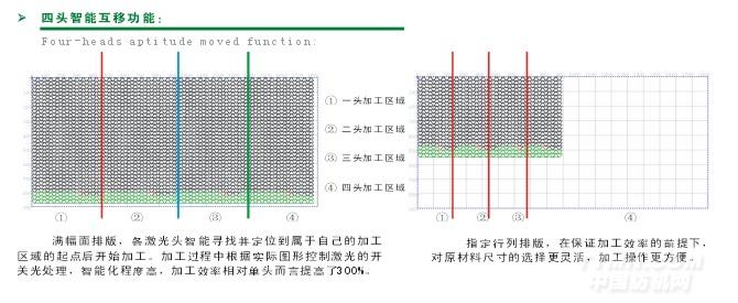 四個(gè)激光頭可根據(jù)加工圖形的不同自動(dòng)計(jì)算最合理加工方案,同送料機(jī)相結(jié)合后形成全自動(dòng)切割系統(tǒng),是目前智能化程度最高的多頭激光加工設(shè)備,較傳統(tǒng)激光切割機(jī)更省料,效率提高4倍以上.