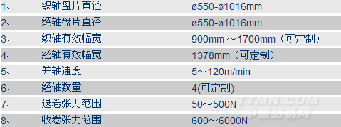 將4個(gè)從整經(jīng)機(jī)上卷繞成的經(jīng)軸,固定排列于經(jīng)軸架上,由經(jīng)軸架的電機(jī)主動(dòng)傳動(dòng)經(jīng)軸旋轉(zhuǎn),并由車(chē)頭電機(jī)在保持均勻的速度,保持有一定張力卷繞成經(jīng)軸,供織機(jī)使用。