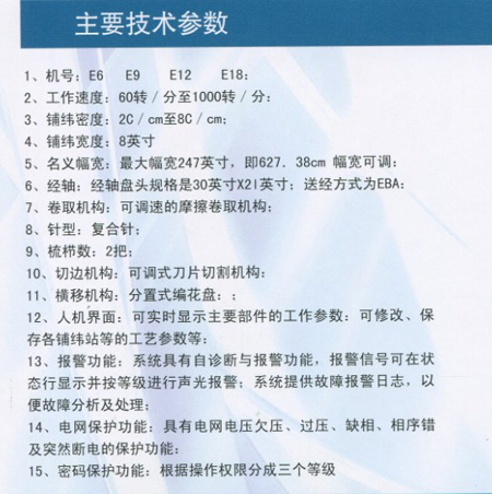 GE2SL-2(帶無(wú)紡布)雙軸向經(jīng)編機(jī)為本公司最新開(kāi)發(fā)的高性能經(jīng)編設(shè)備,采用了獨(dú)特的復(fù)合針,可以減少織針對(duì)緯紗的阻力;緯紗的傳送鉤鏈采用了單排鉤,采用小車在導(dǎo)軌是移動(dòng)的方式鋪設(shè)90度緯紗,采用實(shí)時(shí)雙總線分布式控制,主要用于土木格柵、燈箱布、各種網(wǎng)格織物、防水卷材、運(yùn)動(dòng)地毯、風(fēng)電葉片基布、玻璃纖維布等。