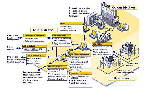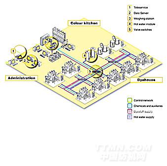網(wǎng)絡(luò)的另一個(gè)功能是控制系統(tǒng),透過(guò)染廠網(wǎng)絡(luò)使流程之間相互調(diào)節(jié)和發(fā)揮最佳效能。還可聯(lián)系訂單管理到機(jī)器的控制單元上,從而組成一個(gè)完整的染廠網(wǎng)絡(luò)。