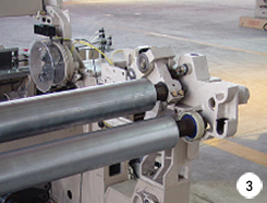 噴氣織機(jī)在引布時,雙壓布輥升降機(jī)構(gòu)可方便地將上、下壓輥同時抬起,與卷布輥產(chǎn)生縫隙將布引出,省去很多人力和時間,安全可靠。