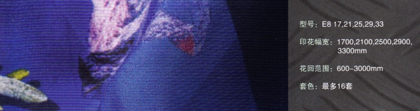 E8機型是基于1944年世界上第一臺平網(wǎng)印花機研發(fā)出來的。這兩個姊妹型號都是有兩個伺服電機同步驅動的。E8的主要特點是外觀時尚美觀,臺板長達32米,套色可以達到16套。
