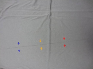 色折痕,又稱行機(jī)痕,水痕,直條痕等(見圖一)。主要是因?yàn)榭椢镌谌緳C(jī)繩狀運(yùn)行時(shí),經(jīng)向折迭部分長(zhǎng)時(shí)間沒有換位,造成起折部分顏色比其它部分偏深所致。組織結(jié)構(gòu)比較緊密的平紋布最容易出現(xiàn)此問題。近年來(lái),一方面隨著針織織機(jī)技術(shù)的飛速發(fā)展,織物的密度越來(lái)越高;另一方面隨著紡紗技術(shù)的發(fā)展,質(zhì)量較差的紗也經(jīng)過(guò)提高紡紗捻度等用作織造。這樣前道工序中過(guò)多的內(nèi)應(yīng)力帶到后序染整加工來(lái),造成織物收縮不一致,織物在運(yùn)行中折迭部分不易換位,最終導(dǎo)致色折痕的產(chǎn)生。