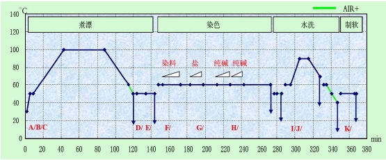 從染全棉的工藝上講,加鹽的過(guò)程取決于處染織物的深淺色度和顏色的敏感度。一般來(lái)講,加鹽工藝分為在染料加入前加鹽(先注鹽工藝)以及在染料注入后加鹽(后鹽工藝),前者適合于深色產(chǎn)品以及對(duì)鹽不敏感的顏色,鹽可以快速以固體狀注入;后者適合于淺中色以及敏感色,鹽需要定量注入到染液中循環(huán)。以往的染色機(jī)在定量注鹽時(shí)總是先將鹽溶解,然后慢慢注入,這需要一定的時(shí)間,影響效率。TEC 系列設(shè)備上首次在定量料桶上加入了溢流化鹽的功能,配合設(shè)備上的定量注入以及主缸回流功能、循環(huán)攪拌功能、蒸汽直接加熱功能以及可以在105℃注入等,達(dá)到最優(yōu)的染色結(jié)果并能增加經(jīng)濟(jì)效益。