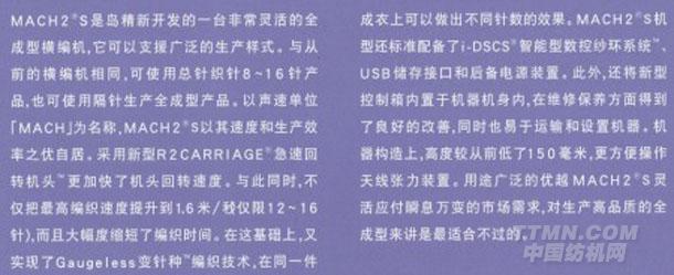 MACH2S全成型電腦橫編機(jī)可高速編織WHOLE GARMENT全成型,且用途廣泛的優(yōu)越全成型電腦橫編機(jī)。