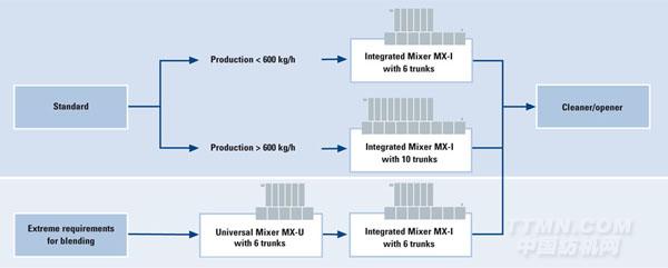 一體式混棉機MX-I——直接將混棉機與一臺清棉機或開棉機合二為一——是緊湊型生產(chǎn)線的理想選擇