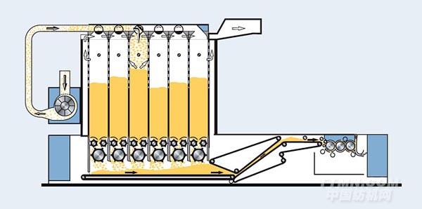 棉箱混棉機最初用在紡紗廠的前紡工序是為了實現(xiàn)特定的、可重復進行的原料混合。棉箱同時被依次填滿和排空,以達得最佳的混合均勻性。根據(jù)實際應用情況,可選擇6棉箱或10棉箱。如果對混合的要求還要高,可串連使用兩臺混棉機(串連混棉)。