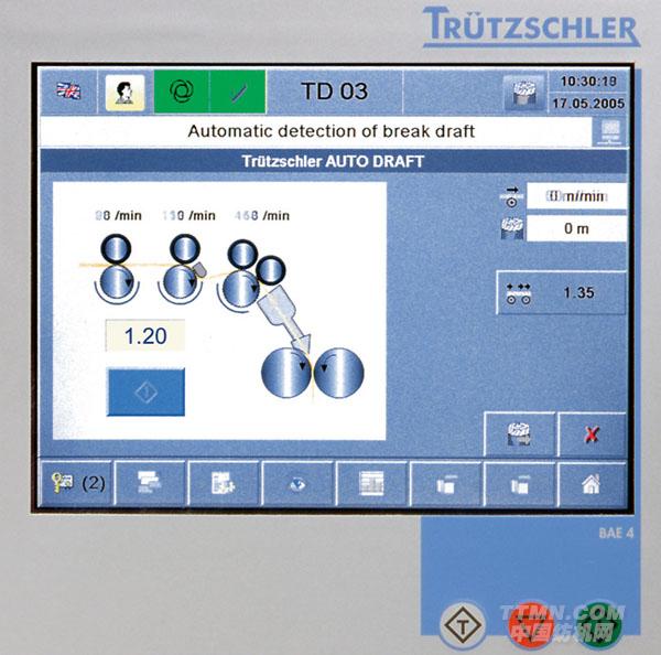 自動(dòng)牽伸裝置AUTODRAFT是自調(diào)勻整并條機(jī)后區(qū)牽伸完全自動(dòng)的自我優(yōu)化功能。該系統(tǒng)在1分鐘內(nèi)就能根據(jù)正在加工的物料給出最佳后區(qū)牽伸建議。AUTODRAFT可作為可選項(xiàng)安裝在并條機(jī)TD03上,但也可以卸除。