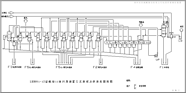 本裝置用于粘膠紡絲浴的蒸濃。把粘膠帶進酸浴中的水分蒸發(fā)出來,保持酸浴組成的平衡,回收從紡絲機出來的酸浴。