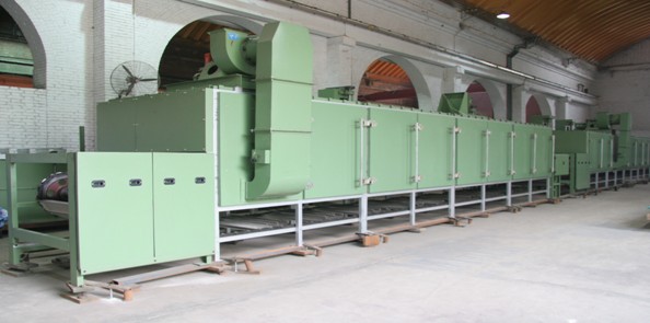 1、產(chǎn)品用途 本機用于粘膠短纖維后處理工序的前區(qū)烘燥,使精煉后經(jīng)濕開棉機開松的粘膠短纖維進行預(yù)烘去部分水份,然后經(jīng)喂給再開松后進入后區(qū)烘燥。 本機由進出口機架、烘房機架、勻風(fēng)板、循環(huán)風(fēng)機、排氣風(fēng)機、管路、散熱器、隔熱門、主動傳和鏈板等部件組成。全機烘房共計4節(jié),烘房框架采用積木式組合結(jié)構(gòu)。 2、主要技術(shù)參數(shù) 機器型式: 連續(xù)鏈板式 產(chǎn)量: 1萬噸/年(30噸/天) 進機回潮率: 150% 出機回潮率: 80% 機器工作寬度: 1800㎜ 機器工作高度: 1350㎜ 側(cè)封型式: 密封板、密封條 使用蒸汽壓力: 0.5MPa 鏈板速度: 0.7~4.2m/min(無級變速) 烘房組成: 4節(jié) 烘房溫度: 約130℃ 總散熱面積: 860㎡ 溫度控制方式: 鉑熱電阻測溫,氣動薄膜調(diào)節(jié)閥控制溫度調(diào)節(jié) 裝機功率: 約51KW 蒸汽耗量: 約900㎏/h 全機外形尺寸: 12200×3280×3570㎜ 全機重量: 約18噸
