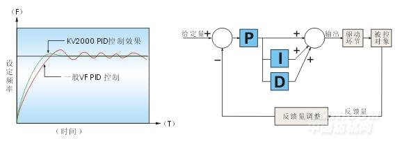 風(fēng)機(jī)、泵類、空壓機(jī)、鍋爐、中央空調(diào)等負(fù)載大部份屬于遞減矩特性,通過PID調(diào)節(jié)即可作為閉環(huán)回 路控制。KV2000變頻器采用最新模糊控制技術(shù),形成最佳的 PID 調(diào)節(jié)功能(參考附圖與傳統(tǒng)變頻器PID 的比較)。