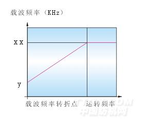 當(dāng)運(yùn)行頻率大于載波轉(zhuǎn)折點(diǎn)時,載波頻率變?yōu)樽畲筝d波頻率設(shè)定值否則載波頻率依運(yùn)行頻率以最大載波頻率和最小載波頻率間自動調(diào)整。