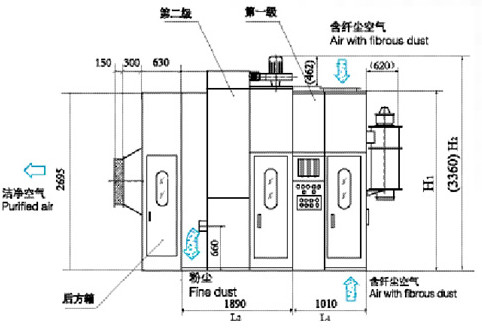 由第一級(jí)除塵機(jī)組和第二級(jí)除塵機(jī)組構(gòu)成。第一級(jí)主要過濾、分離、收集被處理空氣中的纖維和塵雜;第二級(jí)主要過濾、分離、收集第一級(jí)過濾后空氣中的微粒粉塵,使空氣凈化到可以回用或排放的標(biāo)準(zhǔn)。